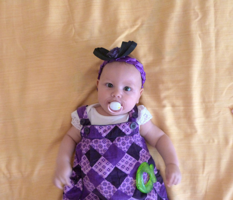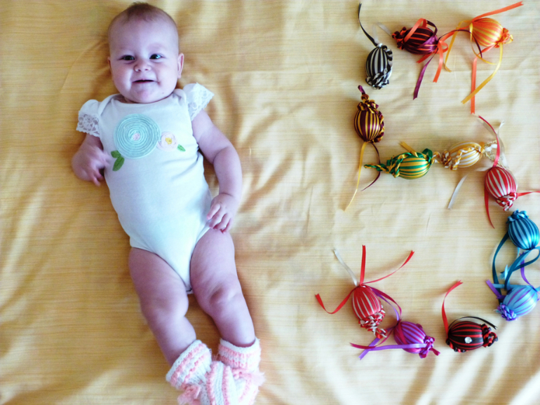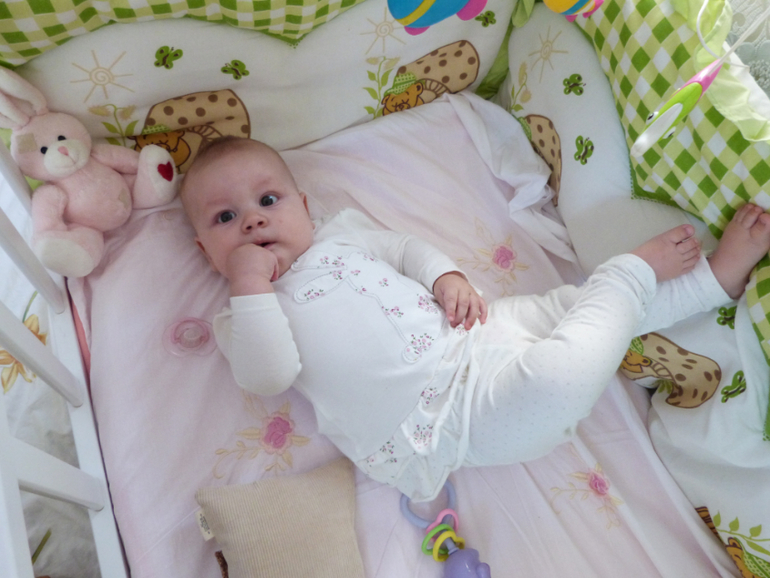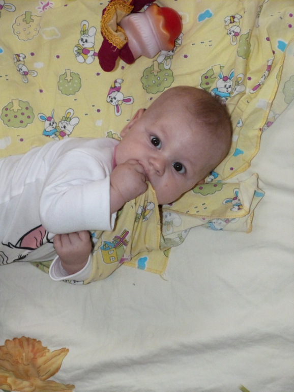 А подросли мы на 1 см и прибавили 700 гр. А значит 66 см и 7700 кг ))) С последнего отчёта у малышки много что изменилось. Например доченька начала очень хорошо переворачиваться с животика на спину. (ни то что бы она ни умела, скорее ни хотела) Если ей надоедает лежать на животе она быстренько ловким движением руки оказывается на спине. Пару переворотов и мы уже на краю кровати. Глаз да глаз нужен. Раньше хорошо было, расстелю на полу и не переживаю, что свалиться. А сейчас уже прохладно стало и особо ни поваляешься.Стесняется. За этим так забавно наблюдать.Практически всех. Особенно тех кто начинает с ней заигрывать. Прячет своё личико, улыбается, а иногда даже повизгивает. Но больше всего меня радует, то что она стала ко мне тянуться своими ручонками. Я в такие минуты просто таю от счастья. Наконец то она стала передвигать ножки. По утрам я её поднимаю и она делает 5-6 шажочков. До этого она их только волочила. Уже крепко стоит на ножках, но только с моей поддержкой. Ползать она и не собирается. Даже если положу ей что то соблазнительное, будет тянуться до посинения, но вот ножками помогать себе не будет. На животе крутится как юла, особенно ночью. Спит мася с нами и частенько будет меня своими пинками. Вот и время летит, ведь ни давно в животике была и так же будила меня своими пиночками, а теперь уже рядом со мной лежит и пинается