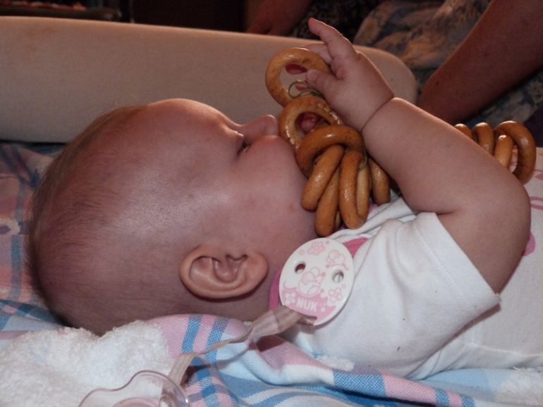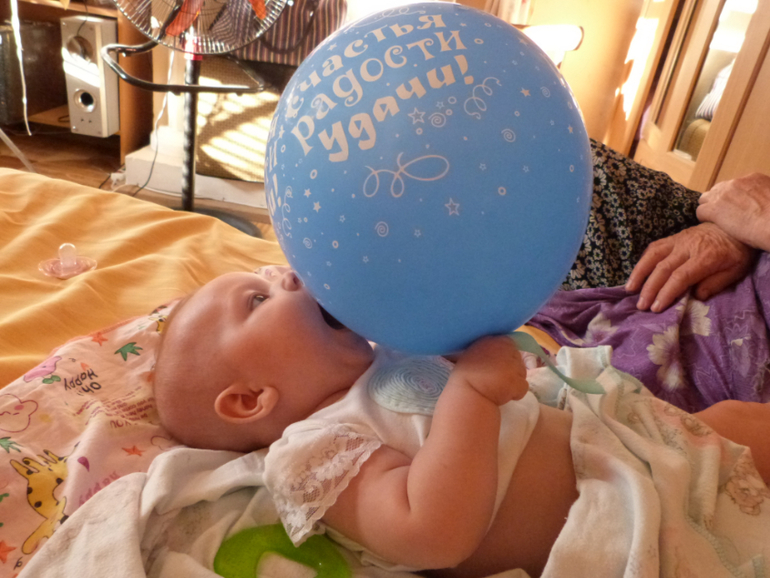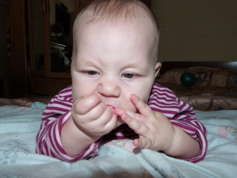 Противопоказано давать крохе пакеты, фантики и бумагу. Потому что если отобрать их, то будет такой крик, что уши в трубочку заворачиваются. Поэтому данные вещи у нас под запретом. Ещё Лизёнок научилась бить открытой ладошкой о разные поверхности, особенно часто этой "поверхностью" оказываюсь я))) И волосы, она поняла, что если за них подержаться, а потом подёргать можно услышать интересные звуки.