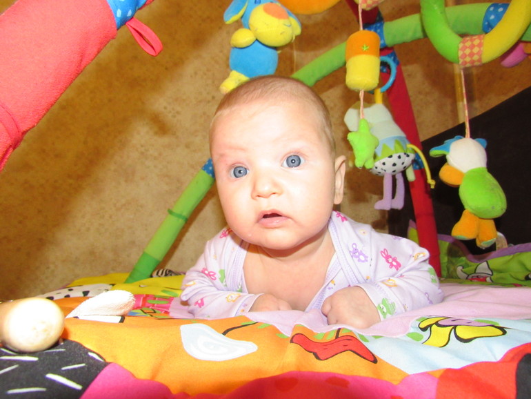 Моей синичке уже три! Такой позитиффный человечек))) улыбается своей беззубой очаровательной улыбкой))) Гулит, разговаривает - болтушка моя! Любит поговорить с живым человеком, хотя среди игрушек и предметов тоже находит себе собеседников. Переворачиваться начала на животик. Сосем вкуснецкие кулаки. Следит за игрушками, и за людьми мимо проходящими. Уже начинаем рассматривать свои пальчики на ручках. голубоглазка моя)))))