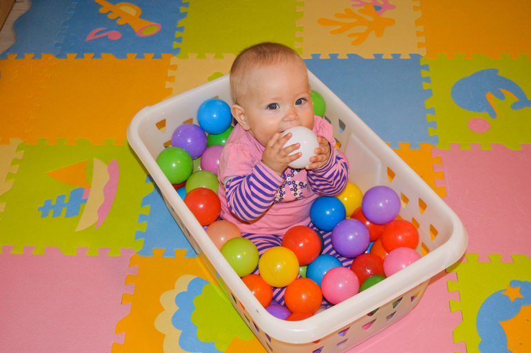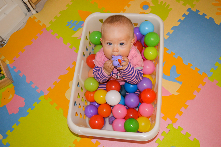 В общем, я думаю, Белле ещё надо дорасти хотя бы до лягушатника, а там уже докупить ещё хотя бы 300 шариков, чтобы можно было в них барахтаться. Пока что она в них заваливается и зовёт на помощь.