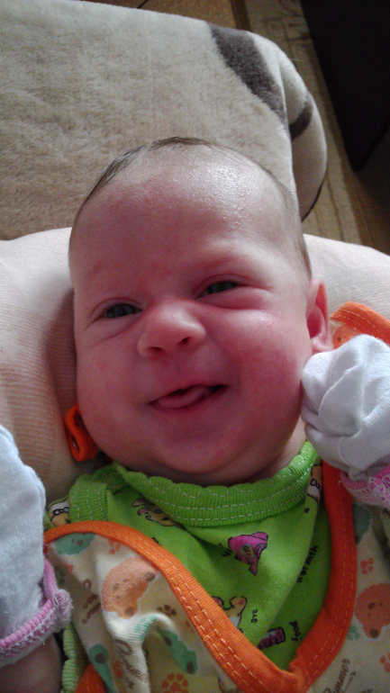 Начали улыбаться и агукать в месяц. Очень любит разговаривать с папой, когда тот приходит с работы)