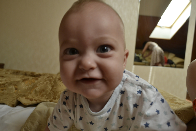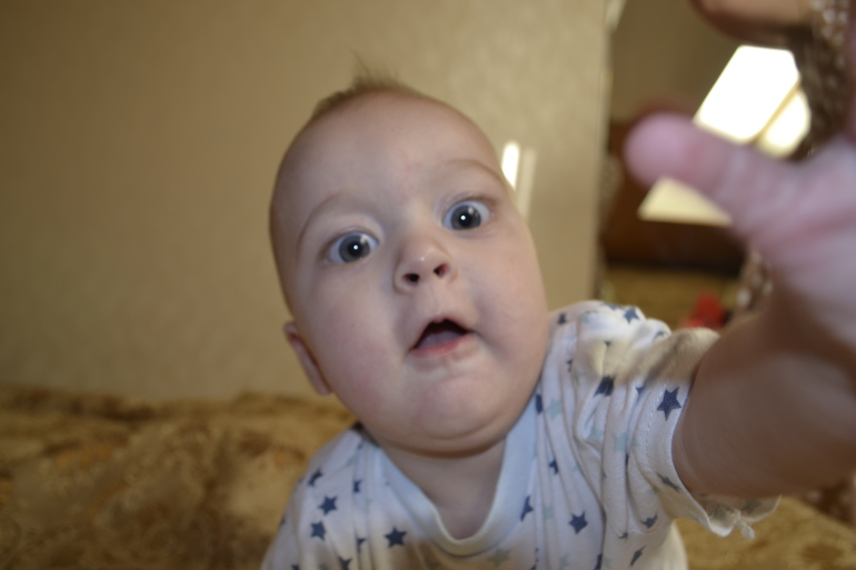 Научился махать рукой на «привет» и «пока», машет левой рукой - будет левшой?)) на мою просьбу «поцелуй маму» подставляет мне щеку или нос для поцелуя))