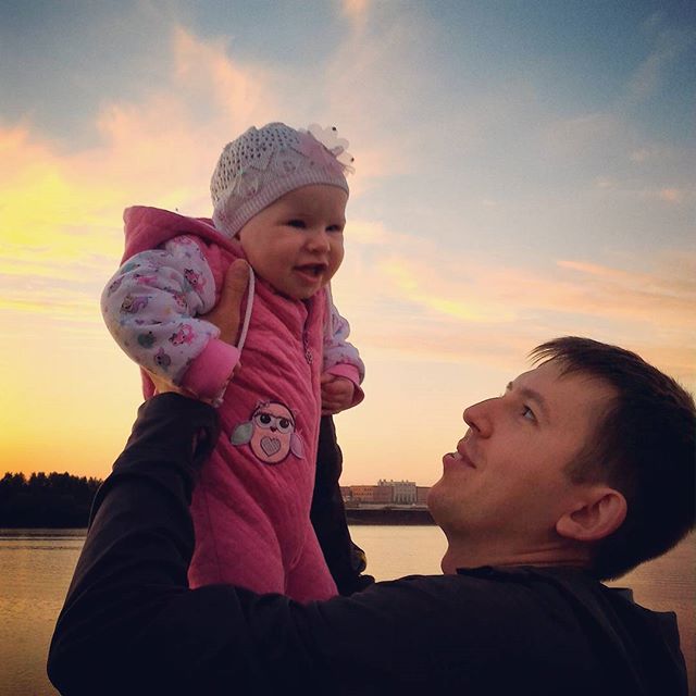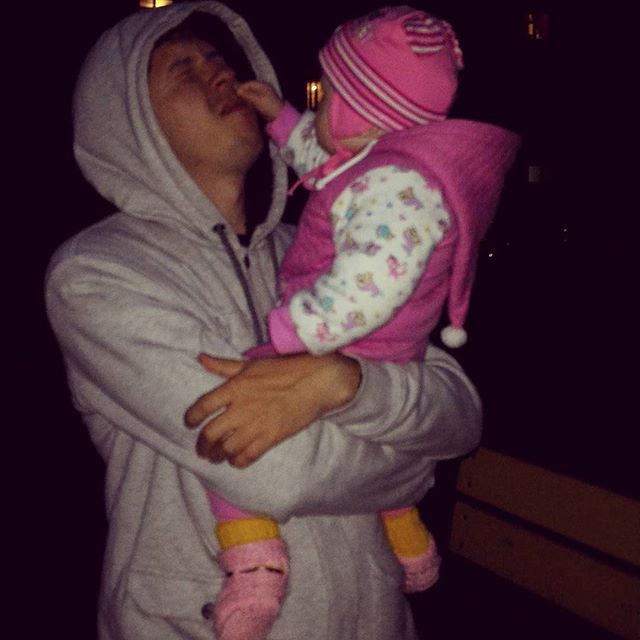 Дёргает папу с утра за уши, папа ругается, но терпит. Усы тоже выщипывать любит, увлечённо так, внимательно.