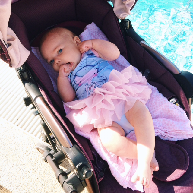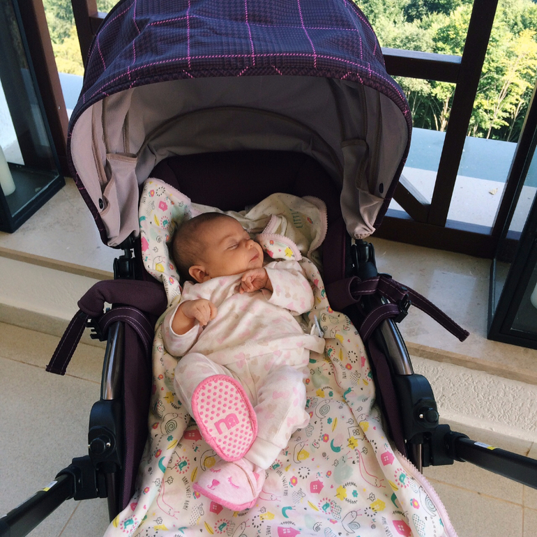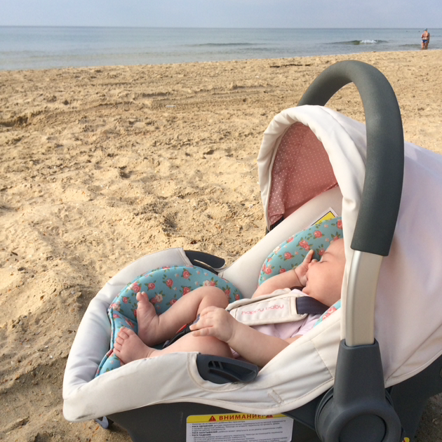 Успели съездить в 2 путешествия :) Сначала недалеко в горы, где покатались на канатке и побывали на высоте 2400м, а на прошлой неделе прокатились 400км к морю. Вообще в поездках малышка ведет себя гораздо лучше, чем дома. Может спокойно лежать на кровати и рассматривать все вокруг, а дома бодрствует исключительно на руках.