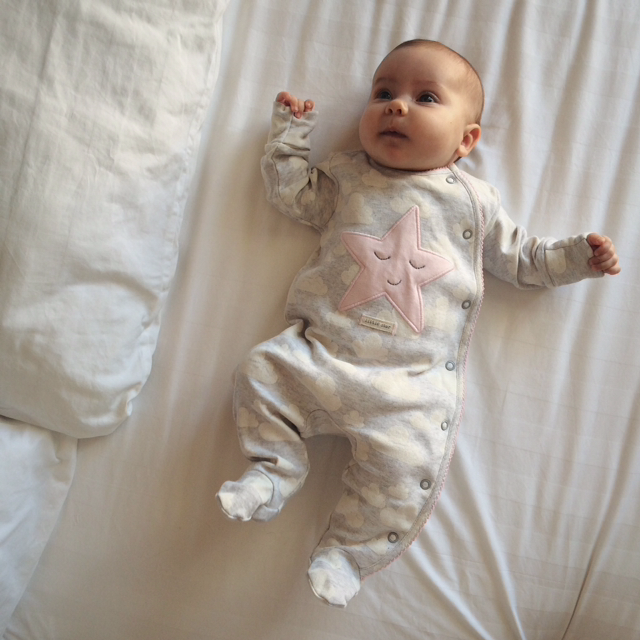 Итак, за 2,5 месяца мы на полном ГВ поправились до 5400г(родилась 3350) и выросли неизвестно на сколько, потому что в поликлинике очень криво меряют) Но начинали с 50го размера, а теперь и 56й уже маловат)