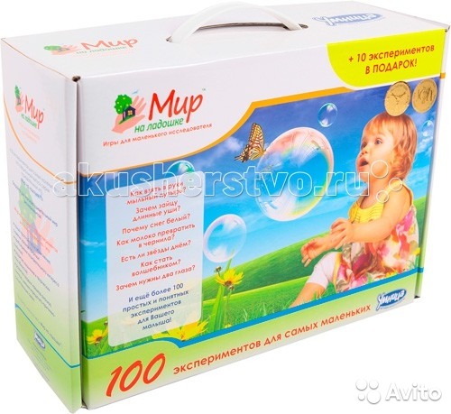 4. Четвертым в списке идет супер-пупер крутая книжка (так говорит отзовик ру) под названием "Умница Мир на ладошке 100 экспериментов". В книге куча экспериментов, которые можно сделать в домашних условиях и завлечь своего шилопопа на вечер, ведь зима будет долгой, а вечера темными:) очень надеюсь, что отзывы не поддельные, так как стоит эта развлекуха 3500 тыщи.