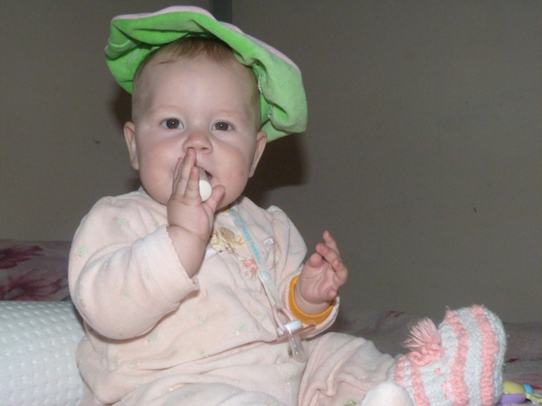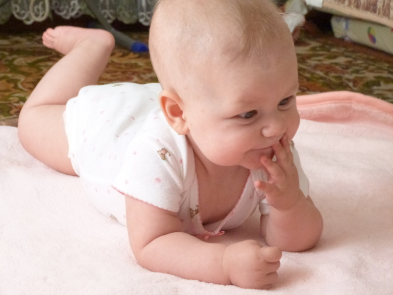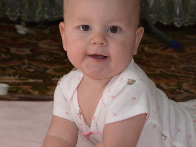 Чего то там "ни срослось" видно, поэтому на этом всё и закончилось)) Но вот ручки у неё сильные. Можно ей дать руку и схватясь за неё она может подняться и сесть. Ещё ни много помочь и она уже поднимется на ножки и будет стоять. Стоит она крепко правда бывает встаёт на цыпочки. Очень ей нравиться валяться на полу, крутясь, вертясь расшвыривая всё что находиться рядом с ней.