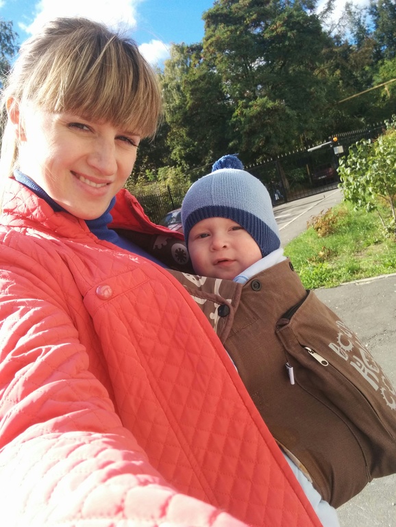 Иногда гуляем в эрго, когда мне нужно по делам или в магаз, куда коляска не проедет.
