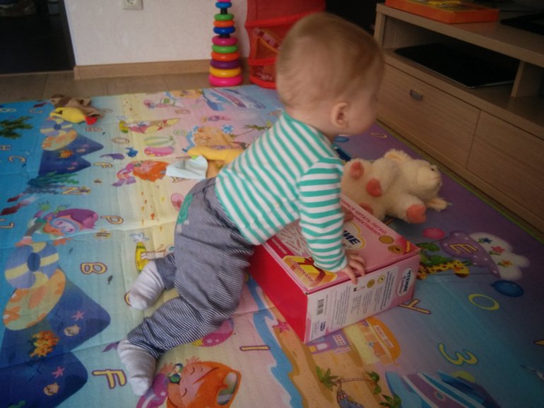 Сначала Ваня ползал совсем понемногу и медленно, а теперь, если задастся целью, может и всю квартиру пересечь. А целью обычно являюсь я. так что ползает тут за мной по квартире один спецназовец и пытается меня обезвредить)))