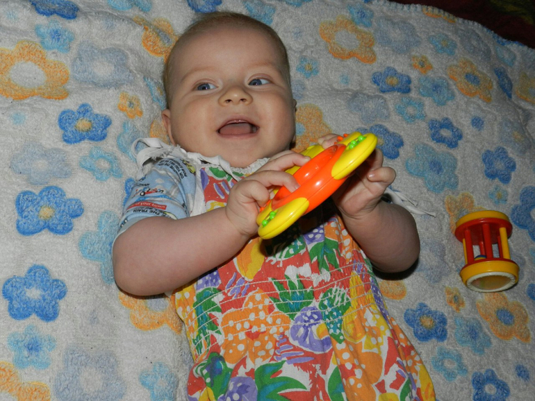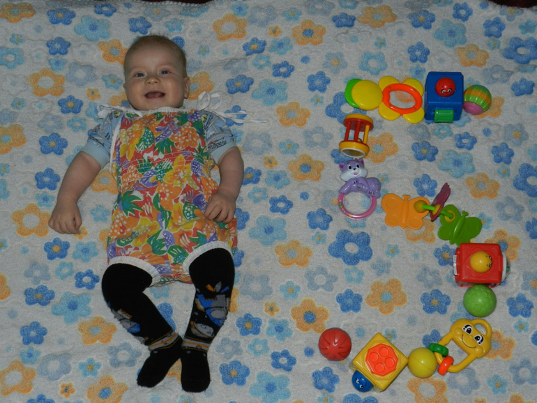 Итак: мы наконец-то уверенно переворачиваемся во все стороны: на живот, с живота, вокруг своей оси))) Активно пытаемся сидеть: цепляемся за все, что можно и тянемся наверх. На руках - только столбиком или на коленях у взрослых, чтоб все видно было.