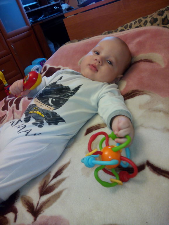 У него сейчас новая фишка - ползти!!! Так уже хорошо встает на задние карачики...и как червячок...ползет...смешной!! пыхтит!! кряхтит!! Уже на диване одного не оставишь!!