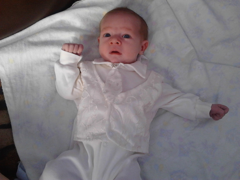 Лапулечка какой!!! А костюм белый - это на выписку был или на крестины готовитесь?