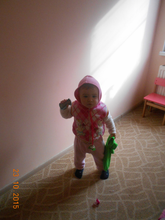 Бегаем мы во всю,иногда так несется что аж ноги запутуються и падаем,но не плачем, а встаем и дальше бежим куда хотели))Евуся растет жизнерадостным и веселым ребенком хохотушка еще та)))Но и капризы мы тоже умеем показывать)А слова Дай и Отдай наверное самые любимые))Пока из слов это и все ,еще мамкаем что то расказумем по своему но в целом я ее как то понимаю что она хочет)Очень любит пищать это капец как запищит аж в ушах закладует))Замечаю как мой реюенок становится все сообразительней и умнее!Понимает что я от нее хочу не всегда конечно но начало уже положено)Приносит что я прошу игрушку там или что то сделать то делает))Конечно как и всякий ребенок любит шкодничать ,а именно: лазить по шкафчикам,вываливать все вещи со своего камода которые только были сложены,ковырять землю в цветах а потом все это рукой размазывать по столу!))