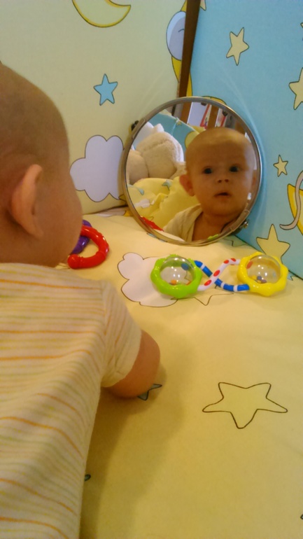 Пару-тройку раз вставал на четвереньки и даже немного подползал. Очень хочет сидеть и ходить, и не объяснить что рано еще-слушать не хочет. Улыбается во весь беззубый рот, но смеется только по ооочень смешным поводам, все называют его философом. Познакомился с Тимофеем в зеркале-