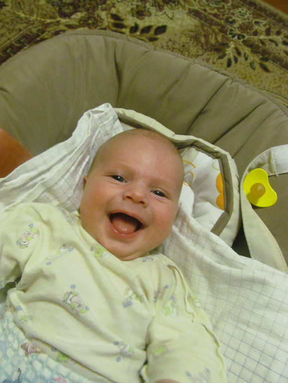 Держит головку и вертит ею туда-сюда. Улыбается всем подряд - людям и игрушкам. Подолгу общается с мобилем. Так забавно машет руками и ногами, типа куда-то бежит-спешит)).