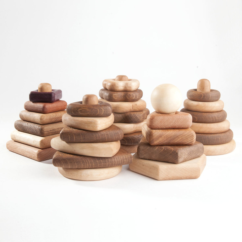 Когда я дала пирамидку сынуле, он сразу же начал снимать с нее колечки, ощупывать их и пробовать на зубок, стучал ими и кидал. И только стал надевать венцы обратно на стержень. Он еще это делает хаотично. Эта пирамидка в этом отношении дает практически максимальное количество возможностей. Венцы легко снимаются и одеваются. Они сделаны из разных пород дерева, имеющих разную текстуру, плотность, вес и звучание - их интересно и приятно перебирать в ладошках, рассматривать и грызть. Благодаря тому что каждая деталь имеет свою форму - она по своему ведет себя при бросании на пол.