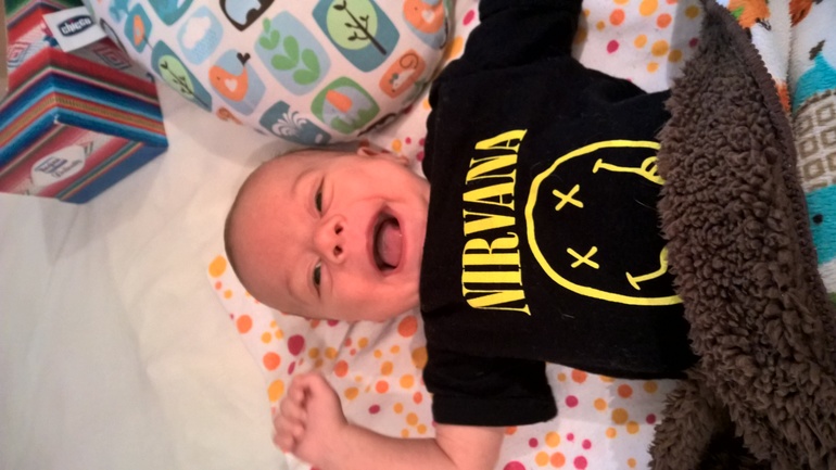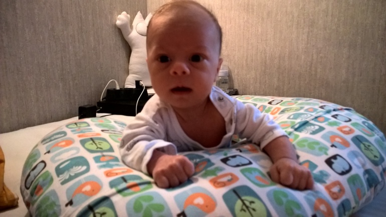 Из умелок: болтает уже во всю. Любимые слова - «агу» или просто «гу» и «ай». Если болит животик, кричит «гииии». А так у нас в арсенале ещё «ага, аги, бу, да и ня». А вообще очень весёлый и любознательный малыш. Постоянно улыбается, смеётся и агукает)). Со спины на бок переворачивается уже легко. Очень хочет научиться переворачивается на пузик, но пока немного не хватает сил. Надеюсь, ещё хоть пару недель не будет получаться, а то закончатся наши спокойные дни без переворотов туда-сюда ))). За игрушками внимательно следит, уже любит мобиль и игрушки на стульчике. Режим стабильный пока только по ночам: ложится около 24, в 4 и 7 Кушает, в 10 окончательно просыпается. Иногда вообще ночью не просыпается, только часов в 6-7. Все зависит от животика.
