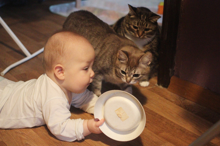 Утро символично началось с поиска заглушек для розеток. Малыш ползает. Недели две назад встал на четвереньки, пораскачивался, плюхнулся на пузо и пополз подстреленным солдатом. За две недели навык отточился и теперь малыша можно найти в самых укромных уголках квартиры. Пока что протирает полы пузом, на четвереньках только буксует на месте. Сегодня разведал путь на кухню и первым же делом опрокинул кошкины миски с едой. Кошки обалдели и мне кажется поняли, что прежней жизни им уже не будет. К счастью, сын решил что кошачий корм в его рационе пока не актуален и увлекся больше миской. Я, как ответственная мать - фоткала.