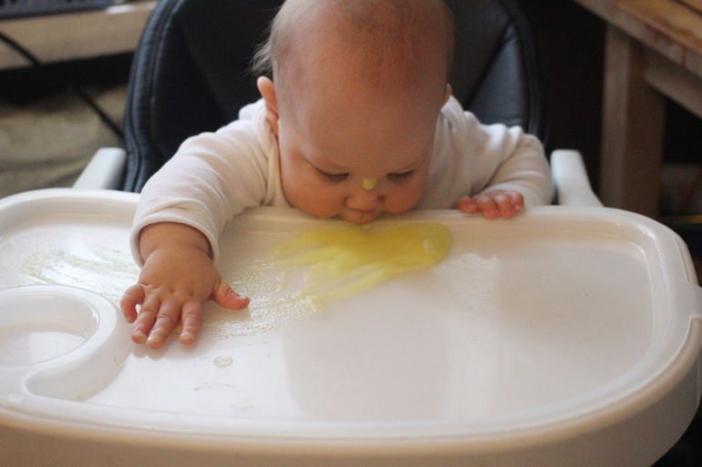 А это мы пюре пролили. Ладно, я пролила. Но радости у ребенка не было предела, дала извазюкаться по самые уши.