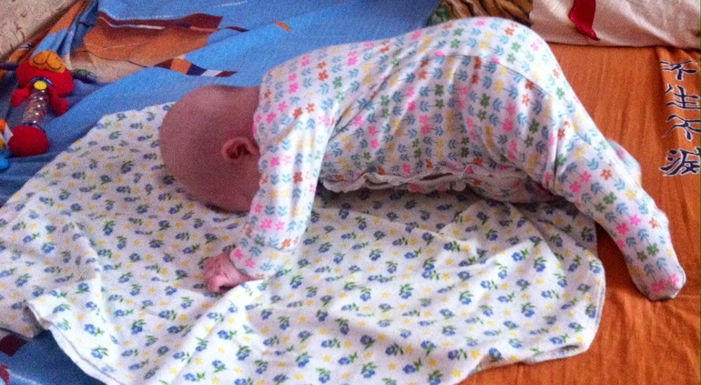 Это так забавно выглядит, становится на коленки, раскачивает попу и прыгает как лягушка, руки еще не умеет переставлять осознанно! По полу тоже ползает, но свободного пространства в нашей комнатке там меньше, чем на кровати! Но все ровно, раз преодолевает дистанцию, хоть какую-то, я считаю - ползает)))