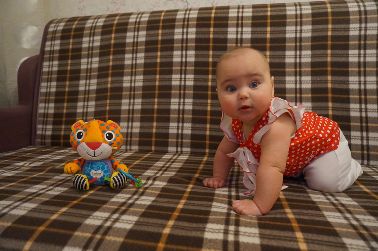 К 5 месяцам переворачивалась через обе стороны и начала вставать на руках. Уверенно держать и играть с погремухами, поняла (наконец-то!) зачем висит над кроваткой эта штука (мобиль) и какой же все таки интересный развивающий коврик!