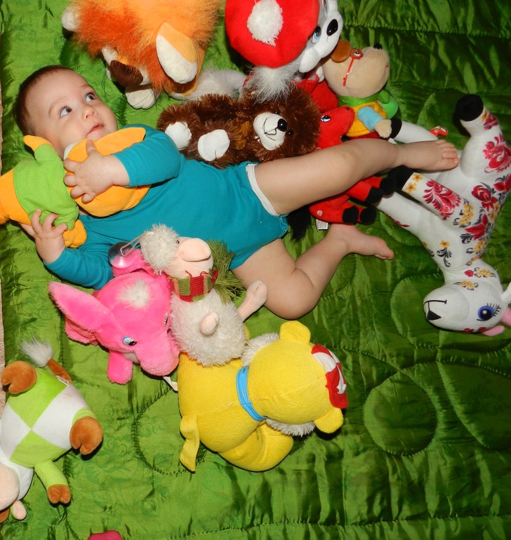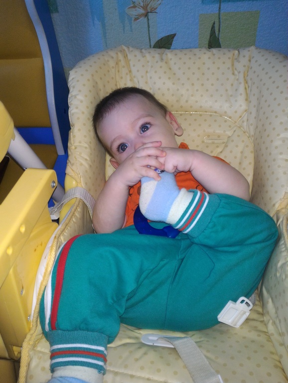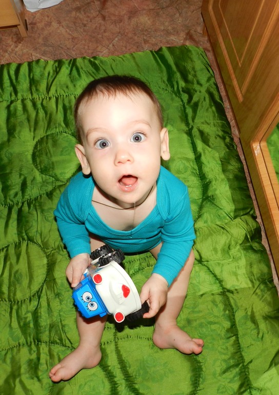 И за этот месяц он стал ЕЩЕ активнее. Почти встал на четвереньки, тренируется каждый день, пытается ползти, но еще никак не получается. Сам не садится, но сидит немного если посадить или если найдет за что зацепиться. Обожает за руки ходить, и пинает мяч, папа научил. Показывает дай-дай. Тянет руки, когда хочет на руки. Постоянно говорит: "га-га-га", за что получил прозвище злобной утки))) Частенько проскальзывает Ага, ма, да и т.д.