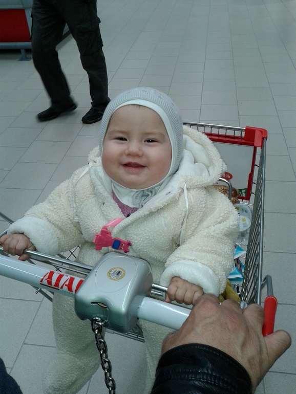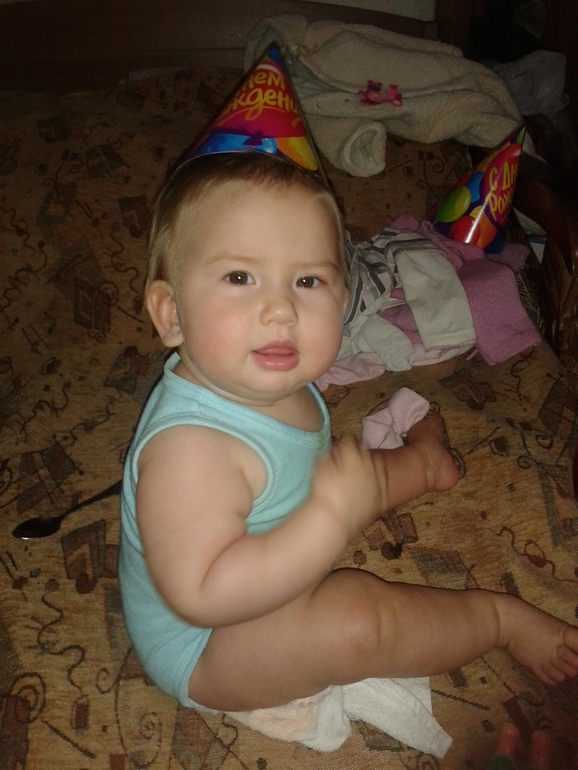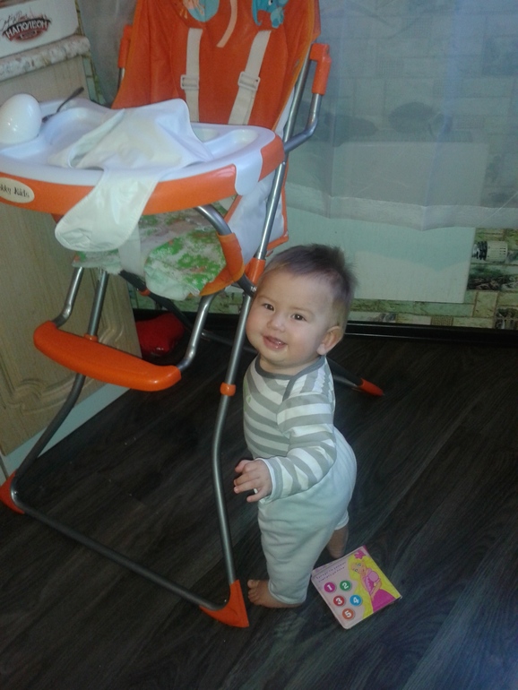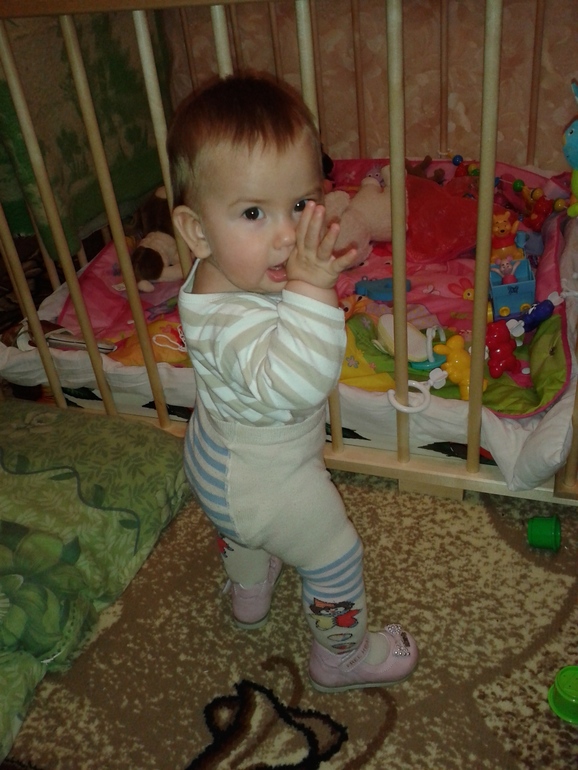Рост 66 см, вес примерно 8500 (8300 был 2 недели назад). Ходим у опоры вовсю, ползает как метеор, пытается сама стоять, но пару секунд и потом плюхается на попу. Говорит баба и мамам)))и еще кучу непонятных мне слов(звуков). Разговаривает очень громко, голос прям командный))) Утром просыпается, просовывает ручку через прутья кроватки и гладит меня по голове