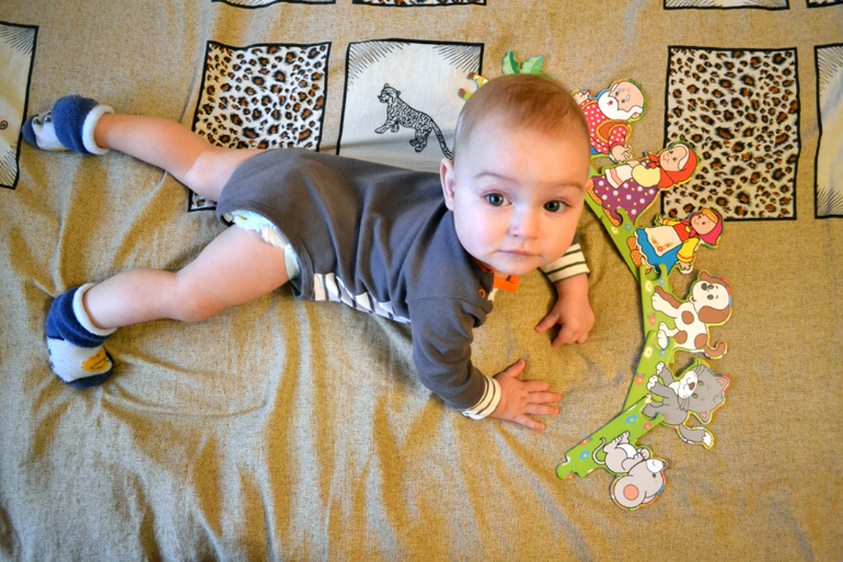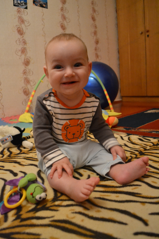 26.10 - научился вставать на коленки. Раскачивается из стороны в сторону, взад-вперед, но до сих пор не понимает, как переставлять руки и ноги. Поэтому мы с мужем взяли роль координаторов движения на себя. Он делает "шаг" ножкой, а я в это время ручкой...так и ползем все вместе. Со стороны выглядит наверное дико смешно, ну а что ещё остается нам делать?