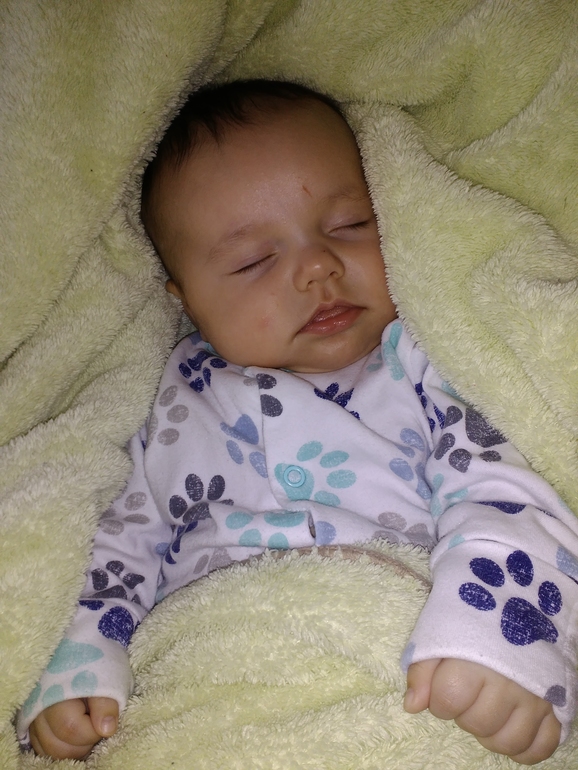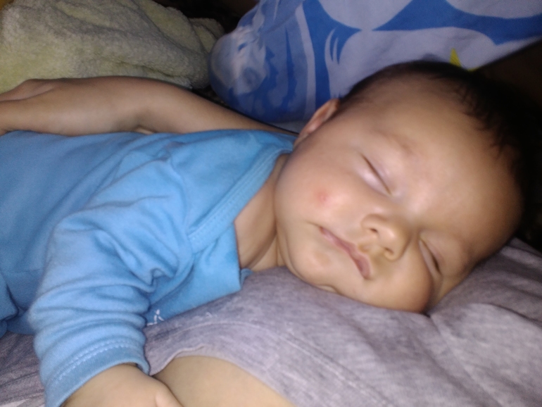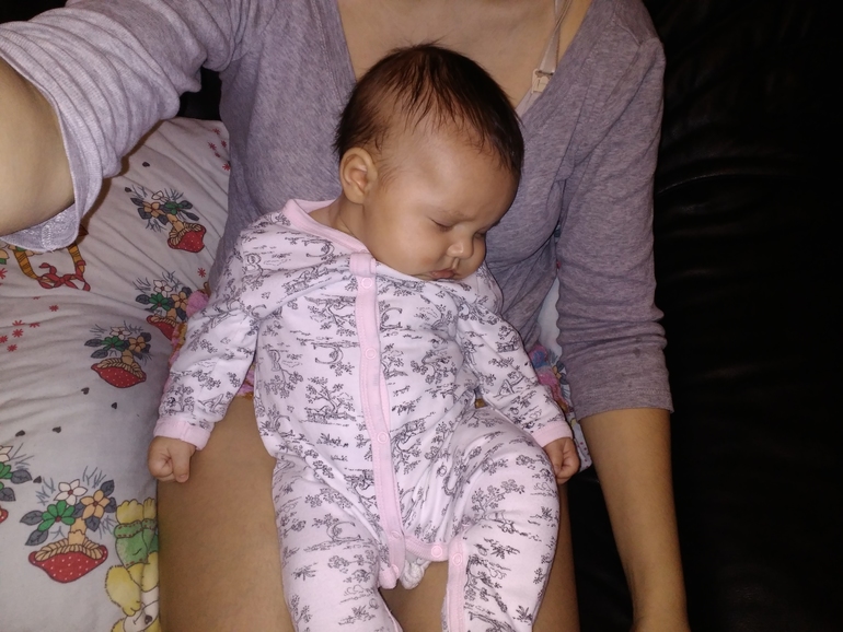 Ночью спит практически не просыпаясь(1 раз,редко 2).Крепкий сон начинается после 23:30.Днем спит или под сиськой или в люльке и не долго.