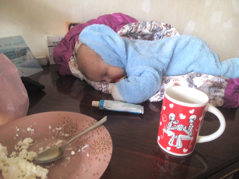 ЮморЧаще всего Дамир засыпает на животике Я решила наконец сесть позавтракать и мне пришла мысль, а не положить ли мне его на стол перед собой! И положила))) Он смотрел, смотрел на меня и уснул, а я спокойно поела!!!))))