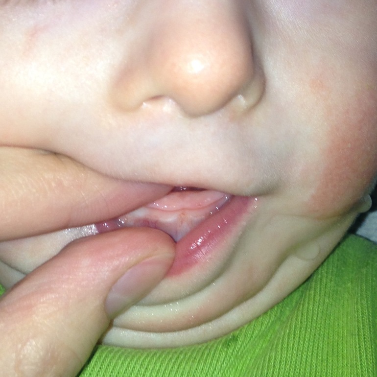 у нас была на десне ранка типо такой перед тем, как вылез зубом. но было хорошо видно белесую полосочку под десной.