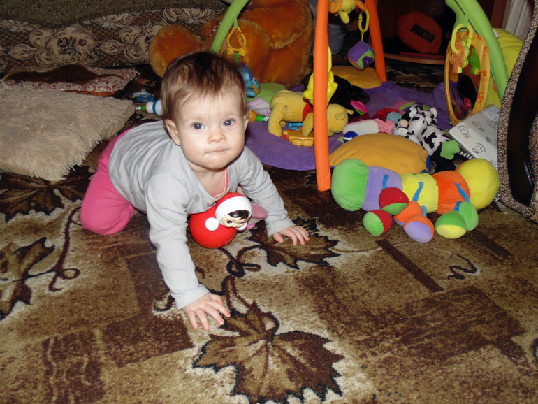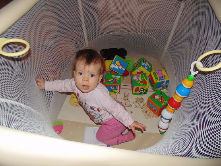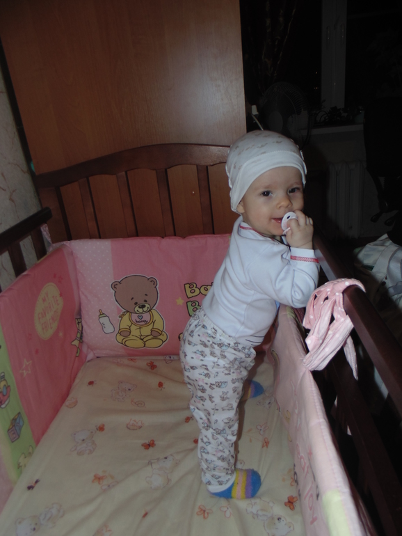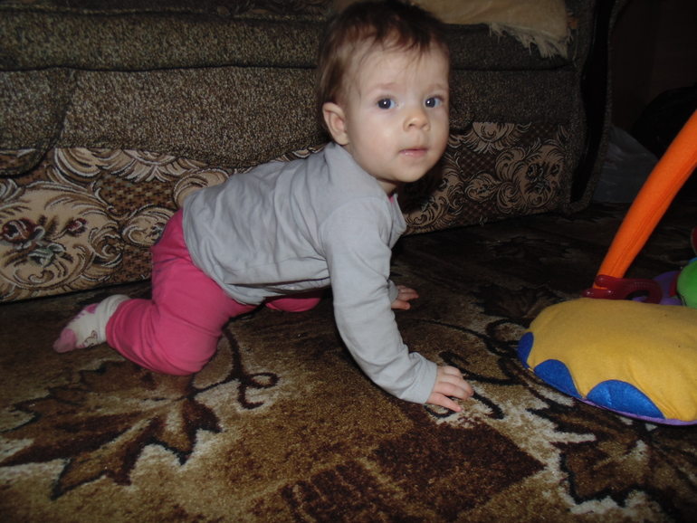 Мы уже совсем большие девочки. Из умелок: ползаем на четвереньках (по пластунски уже не интересно), сидим, встаем и ходим (правда кривенько-косенько) у опоры , если стоим и вдруг понадобилась игрушка,сядем на корточки или попу и достанем то,что нам надо. Зубов у нас по прежнему нет