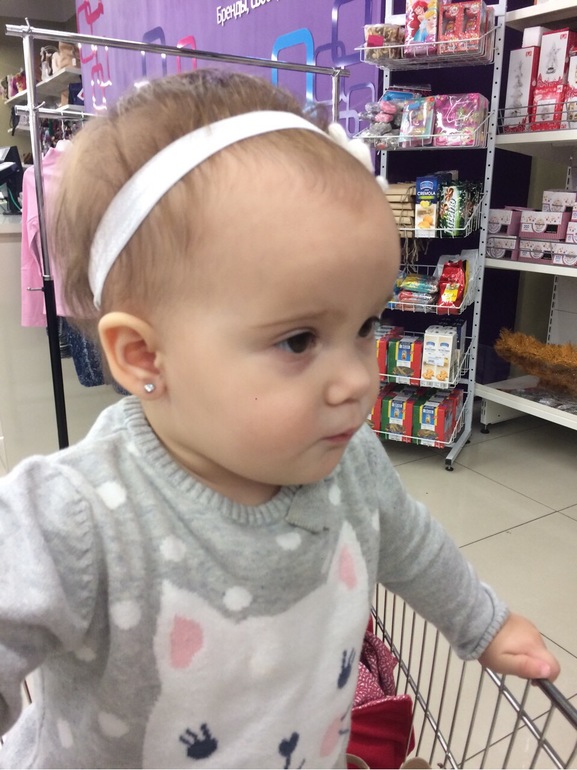 Ближе к году спросила у мужа, не будет ли он против,если мы Полине проколом ушки, пока она маленькая,он ничего против не имел.