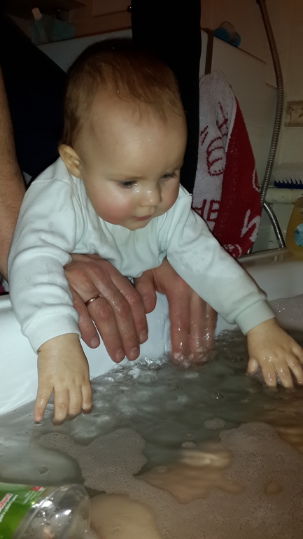 У нас эту проблему решил стульчик в ванну и игрушки, теперь из воды не вытащишь( тьфу тьфу тьфу), сидит игрушками по воде бьет довольная брызгается , грызет))).