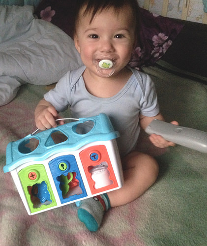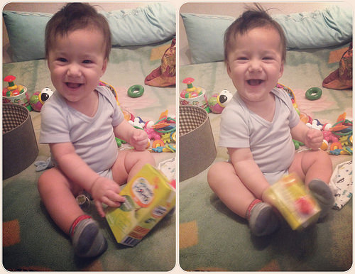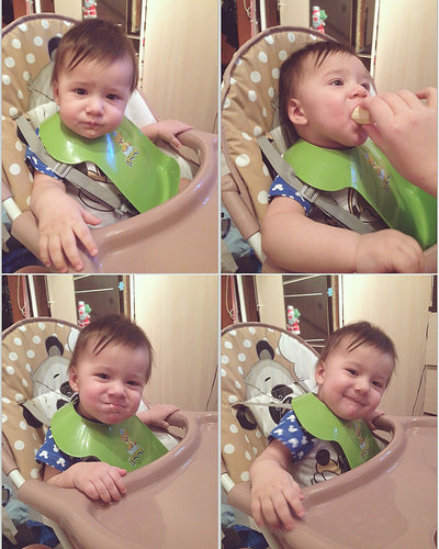 Не смотря на отсутствие зубов, кушаем банан без ниблера. Сначала страшно было, что подавится, а потом смотрю, он и яблоко, не сосет, а жует деснами Оо Попробовала ввести кефир, йогурт и биолакт Агуша. Отказался напрочь(( Пока не настаиваю, пьем только кисломолочку на ночь и смесь под утро один раз. Режим все еще такой же: встаем в 10.30, сон 13.30-15.00 и 18.00-19.00, на ночь уходим в 23 часа. питание: 8-9 утра смесь 210, двенадцать дня каша около 250 и 2 печеньки хэинз, 16.00 мясо+овощи, половина банана, 19.30 творог+фруктовое пюре и в 23 часа кисломолочка. Все не дает покоя наша прибавка в прошлом месяце - 1,2 кг. При этом сын носится, как угорелый. Откуда такая прибавка? Вроде не перекармливаю.