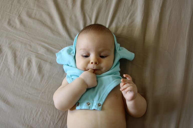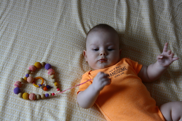 Начали всё хватать. Мы теперь - его транспорт. Нужно сесть на ручки и гулять по квартире, а ему всё щупать и желательно в рот ) Вернулись к слингу, очень иногда спасает.