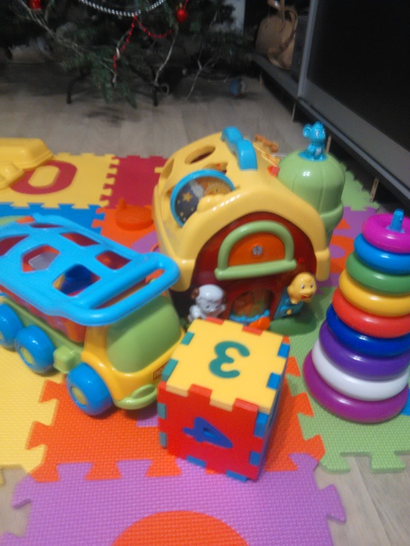 А так "занимается своими делами" - ползает, открывает шкафы, рвет и жует любую бумажку, до которой смог дотянуться, разбирает ящики, гладит кота, катает шарики....в общем - развивается самостоятельно)))