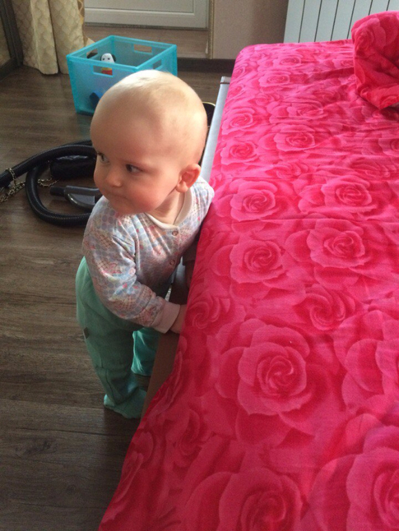 у опоры начали встатать в 9 мес, сейчас это делает постоянно и где угодно, отпускает руки, пытается перемещаться от опоры, сегодня протянула ему руку, сделал шажок от от кровати ко мне, весь шатается, переваливается, трясется, так смешно и удивительно, снимала на видео, пересмотрела этот момент уже несколько раз, пластунские ползания наконец-то кончились, аллилуйя, 3 -ий день как начал ползать на коленях и самостоятельно сел, ура-ура-ура, (горшок куплен, ждет своего часа) все таки массаж тоже дает свой толчок, у нас очередной курс, сегодня было 5-ое посещение.