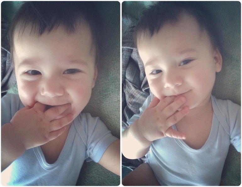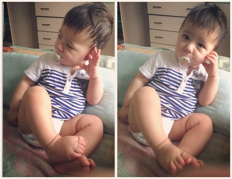 Уже стал многое понимать. Говоришь ему пойдём мыться, встаёт, подходит и обнимает за шею, типа, неси. Или хулиганит, говоришь, "ты почему это делаешь? Я же не разрешаю!". Сразу подползает, тыкается лбом в грудь, поднимает полные раскаянья глаза. Я конечно смягчаюсь, сын это видит и снова идёт хулиганить)))
