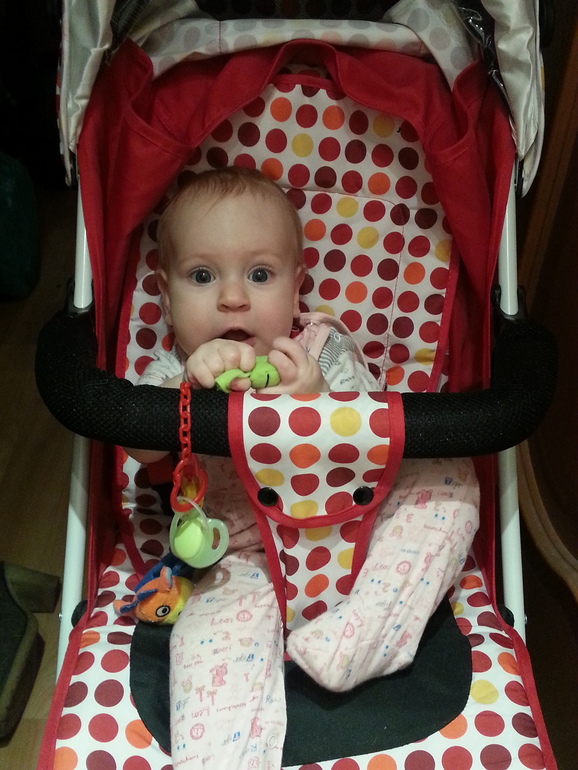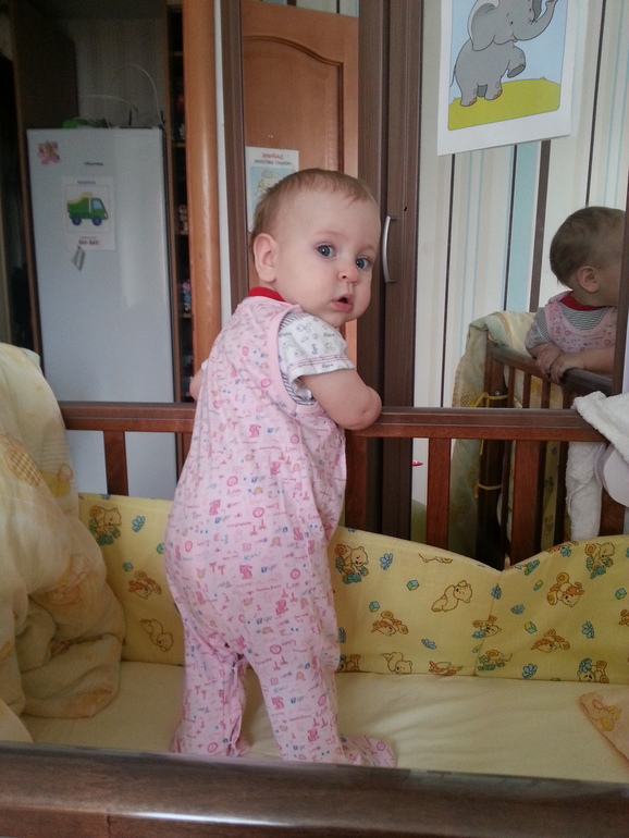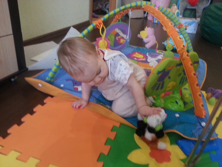 Сначала умелки. За этот месяц Аня научилась сидеть без опоры (в 7 месяцев и 1 день), сама садится (в 7 месяцев и 3 дня) и ползать на четвереньках (в 7 месяцев и 24 дня). Научилась махать привет и пока-пока. Итого мы умеем: садится и сидеть без опоры, ползать, вставать и передвигаться у опоры (иногда отпускает руки и стоит пару секунд без опоры, но потом пугается и либо хватается за что-то, либо на попу падает), махать "привет" и "пока-пока", знает свое имя, иногда отдает что-то на просьбу "дай" или "положи", лепечет постоянно, в основном, мамкает, не иогу сказать точно осознает ли она, что я "мама" или просто мамкает.