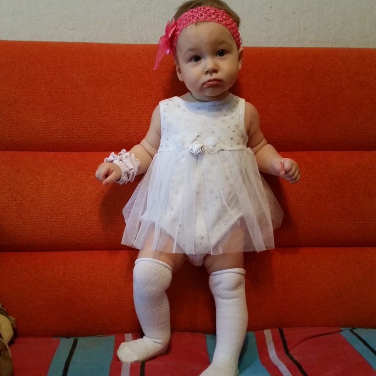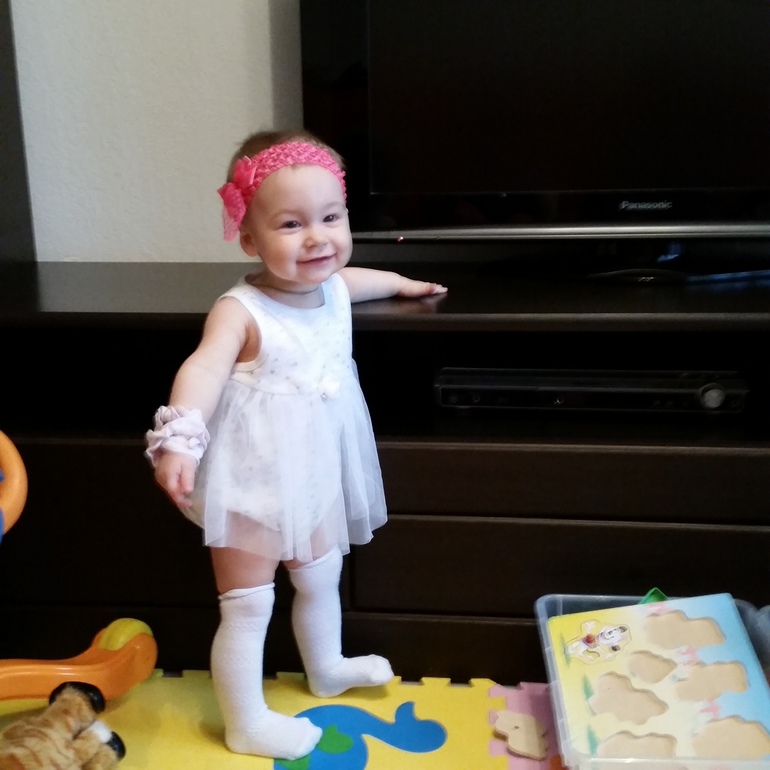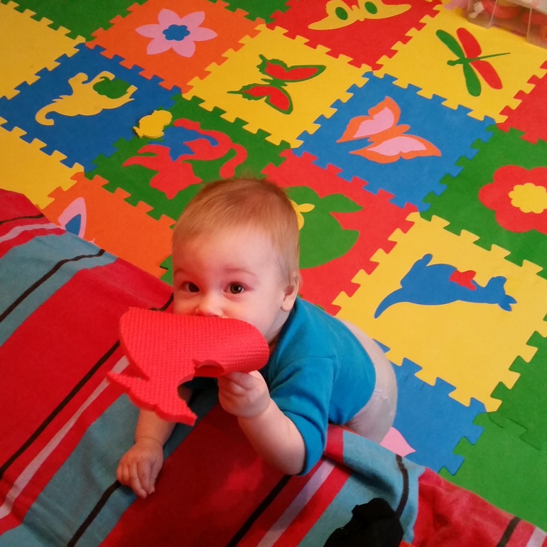 Зубов все так же 2. Но руки постоянно во рту, да и сон желает лучшего. Все так же бегает вдоль опоры, но сама стоять боится. Пару раз сек. на 10 замирала сама, то потом плюхалась на попу. Боится пока. Ползает как уроган 😂.