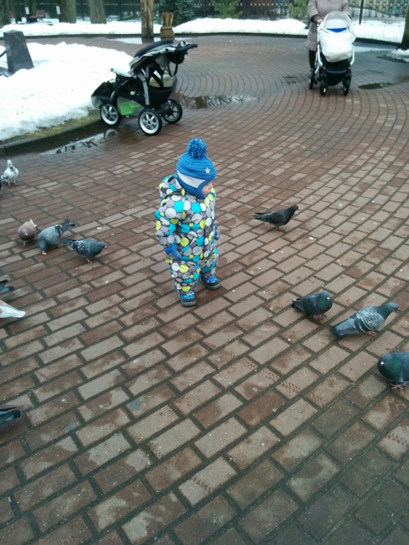 Гуляем каждый день почти. На улице сын идет исключительно по своим делам. А они у него обычно в лужах, сугробах и трудно доступных для меня местах. Последняя фишка-катить свою коляску. Наверное, час точно может катать туда-сюда. Не без моей помощи, конечно.