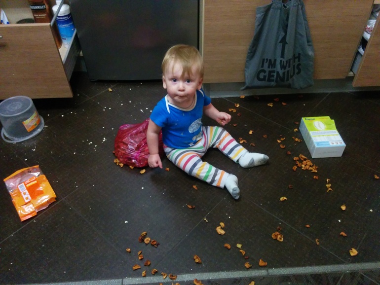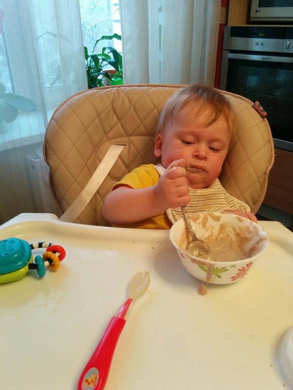 В остальном ест много всего. Мясо пока банки. Иногда котлеты даю. Утку любит запеченую. Жует плохо, не смотря на множество зубьев. В основном все пюреобразное. Каши молочные едим с 11 мес где-то. Или безмолочные на смеси. Смесь уже буду покупать тройку. Это уже какое-то детское молочко. Наверное, продолжу Нутрилон давать. Любит хлебцы. Печенье. Яблоки сушеные, груши. Иногда банан. Супы даю наши. Умнас мультиварочные, без пережарки, на вторичном бульоне и слабосоленые. Иногда варю ему отдельно овощные. На гарниры даю рис, гречку, макароны детские, картофель. Рыбу еще не вводила.