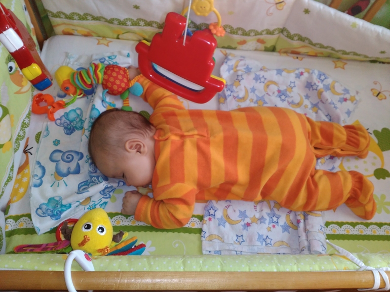 Очень сильная хватка,да и он сам сильный).Может уже сам играться,сам засыпать(сосет большой палец и вырубается)..соску категорически отказался брать.Палец тоже не разрешаю,но не всегда могу уследить..