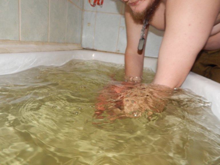 В конце делаем "холодное пятно" - включаем холодную воду в углу ванной и на пару секунд его туда, потом в теплый конец, и так несколько раз. Достаем из ванны, когда успокоится (если его расстроило "пятно") , сразу в полотенце, и сразу кормиться.