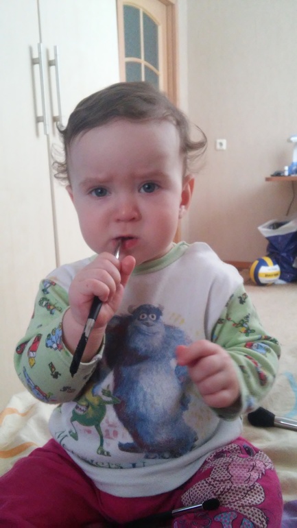 Умелки: на четвереньках шустро носится по квартире,встает и ходит вдоль опоры.Иногда отпускает обе руки и стоит секунд 10-15.Потом плюхаемся на попу)))Иногда правильно слезает с дивана,иногда я еле успеваю поймать(((Пирамидку только разбираем и то,перевернув и разом стряхивая все кольца.Зато освоили сортер и очень полюбили складывать туда фигурки)Играем в ладушки,танцуем,машем пока)Научилась кидать мне теннисный мяч,чему сама безумно рада)))Иногда вместо мяча летит все что под руку попадет)))Знает где глазки,носик)Слоги говорит, мама папа частенько вылетает))Очень любит книжки и музыкальные игрушки,ксилофон и бубен в почете)Сама включает и выключает телевизор.Опустошает все полки и ящики до которых можно дотянуться,а мама собирает за ней))