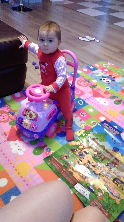 ХвастаемсяКупили все таки машинку - каталку..пока чуток побаивается! И папа купил плакат с домашними животными..сказал его прогрызть нельзя как карточки!