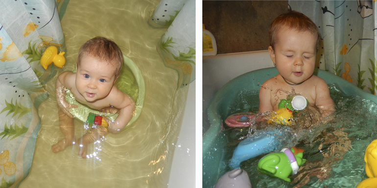 Купаемся или сидя на стульчике в большой ванне или (больше для экономии воды) сидя на антискользящем коврике в маленькой ванночке. Правда, с недавних пор стал сам вставать в ванночке.