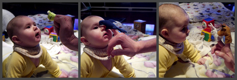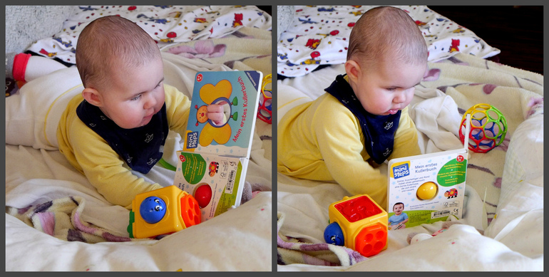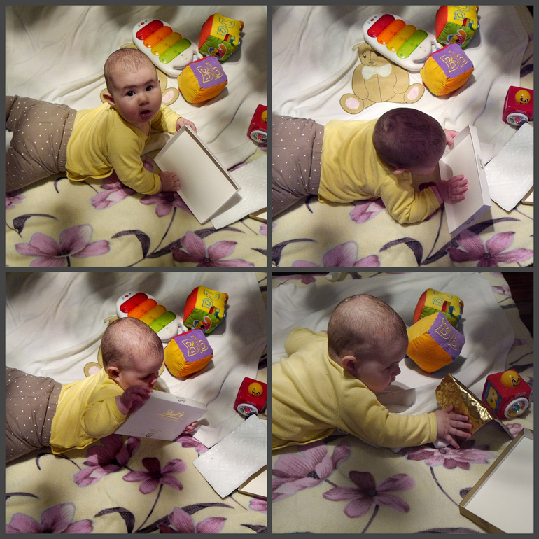 Илария к 7 месяцев стала совершенно самостоятельным ребенком. Играет в манеже или на полу часами, если в нем достаточно игрушек. На руки не просится. Я переживала вначале, не разбалую ли ребенка тем, что я с самого начала таскала в слинге. У меня их было несколько. На пояс, через плечо, колыбелька. Я со слингом ходила в ресторан, по магазинам, путешествовали. В итоге я думала, что ребенок приучится к рукам, но этого не произошло. Поверьте, таскать 9 кг мне уже было бы довольно тяжело. Поэтому Илария видно насытилась мною за все эти месяцы и играет сама прекрасно, чему я очень рада, потому что я хочу, чтобы она умела себя занимать сама. Ну и конечно, мы занимаемся с ней по карточкам Домана просто для ее ознакомления с миром, игруем в кубики, я показываю и называю ей геометрические фигуры, цвета, животных. У нас есть такая смешная игра. Я ей даю мячик, говорю "бросай", она бросает, я претворяюсь, что мне приходится ловить его по всей квартире, она заливисто смеется, когда я его поднимаю.