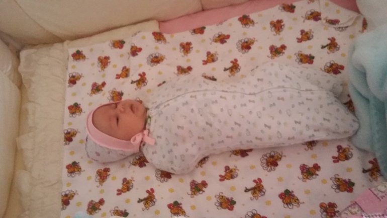 Чаще стала играть и гулять, меньше сна, к режиму мы уже привыкли, ночью спим спокойно, кушаем пару раз! Ногти растут очень быстро не успеваю подстригать, точно девочка, у сына так быстро не расли! Кушает Вета по требованию, приблизительно в среднем через два часа. Лебит тепло и тесноту, ночью еще одеваю на нее кокон наш ночной, ниже фото будет, а днем уже не пеленаемся. В кроватке не особо любит, но приучаем потихоньку, Засыпает и мы ее в кроватку, а когда ночью просыпается, то мы ее оставляем уже с нами. Повились любимые погремушки, которым она очень рада и улыбается! Купается она с удовольствием, водичка ей очень нравится, но вот когда вылазить из водички начинаем плакать, до тех пор, пока грудь ей не дам. Стали сосать кулачек и пальцы, да еще и так причмокиваем, на всю квартиру слышно, чем доча увлеклась.